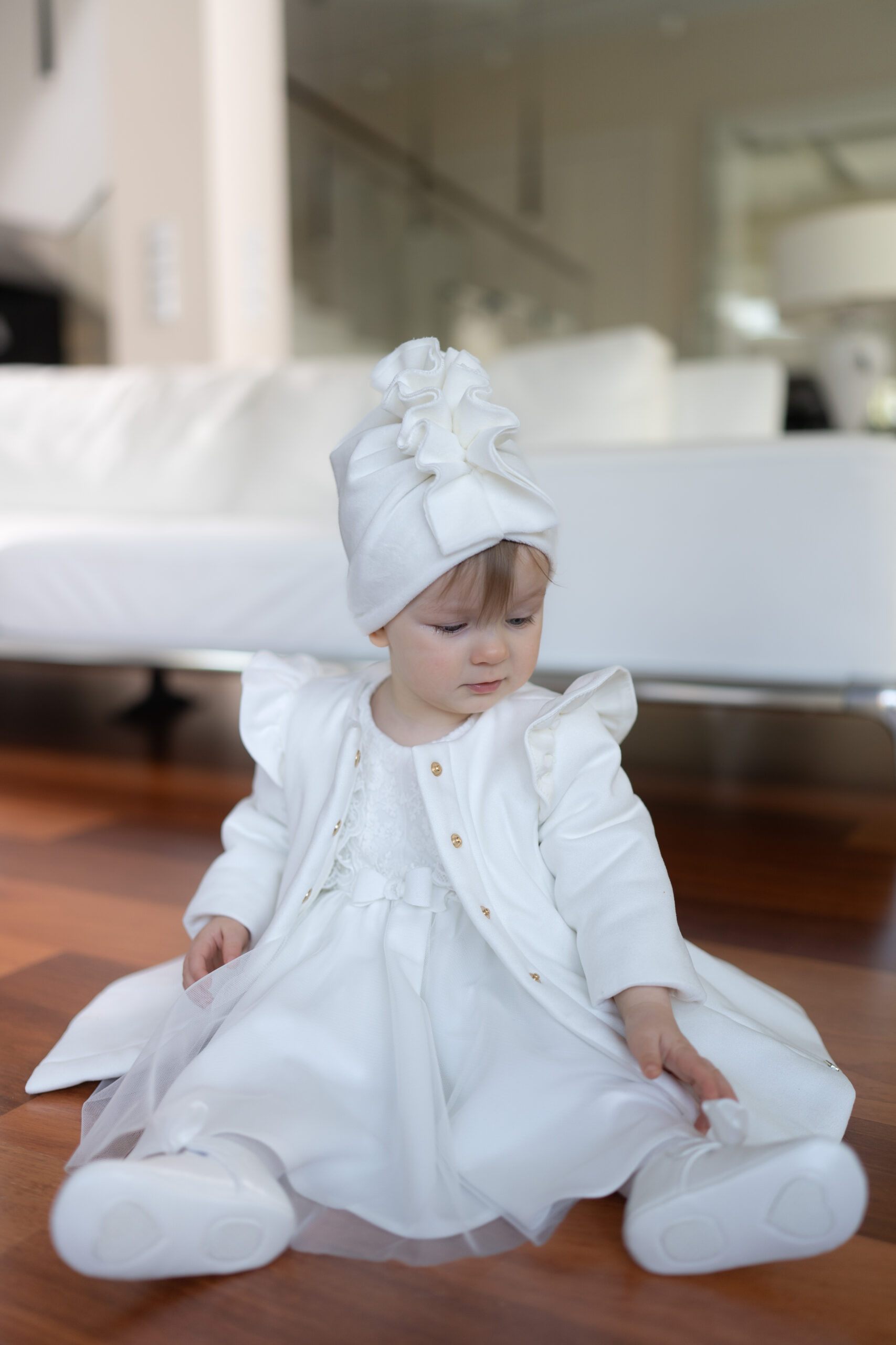 Czapeczka, turbanik w kolorze białym. Na przodzie falbanki zdobiące czapeczkę. W komplecie apaszka. Ideałnie pasuje do białego płaszczyka.