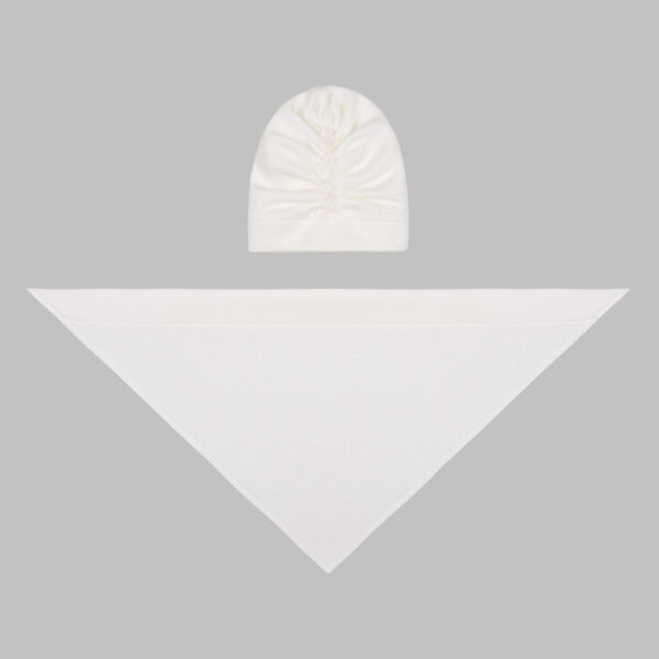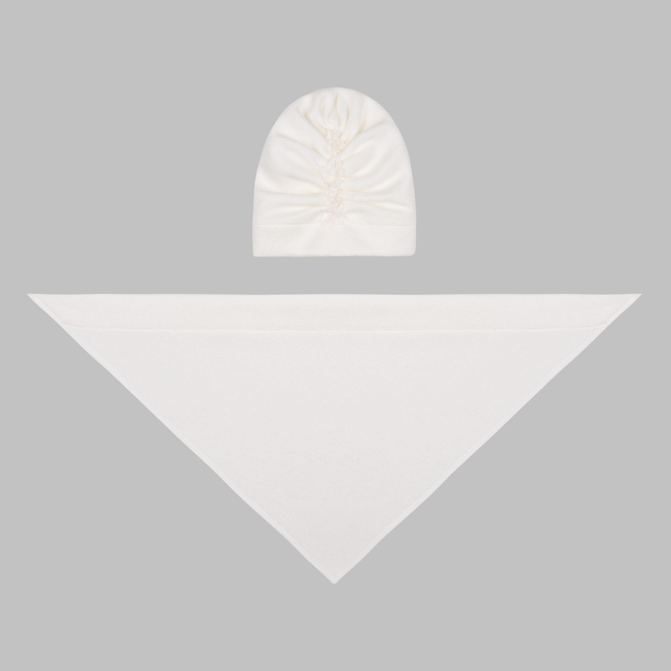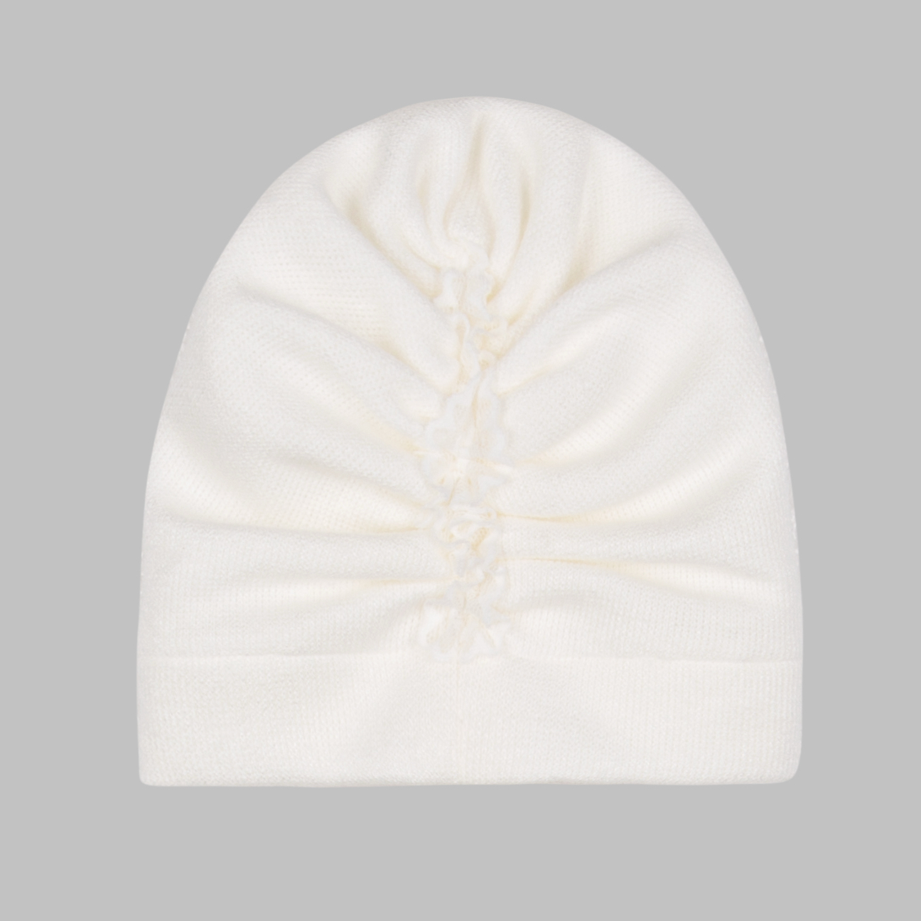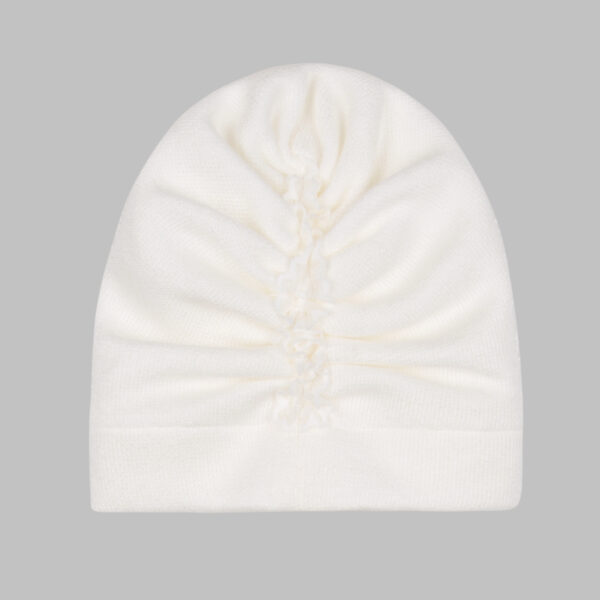 Czapeczka, turbanik w kolorze ecru. Na przodzie falbanki zdobiące czapeczkę. W komplecie apaszka. Ideałnie pasuje do ecru płaszczyka.