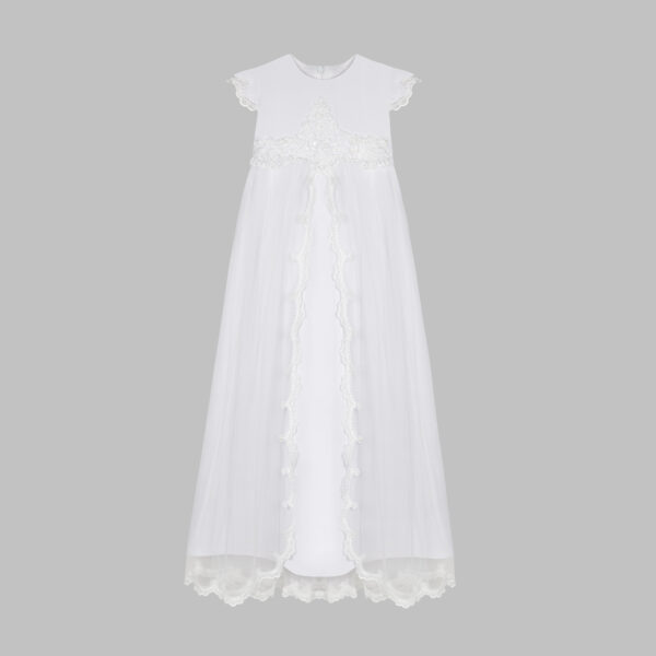 Ekskluzywna sukienka w stylu angielskim w kolorze białym. Spód sukienki wykonany z jedwabiu z dodatkiem satyny. Bardzo miły w dotyku. Na wierzchu pokryty piękną koronką. Całość niezwykle wytworna, unikatowa.
